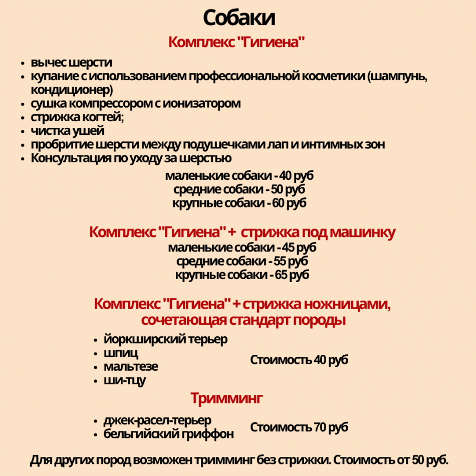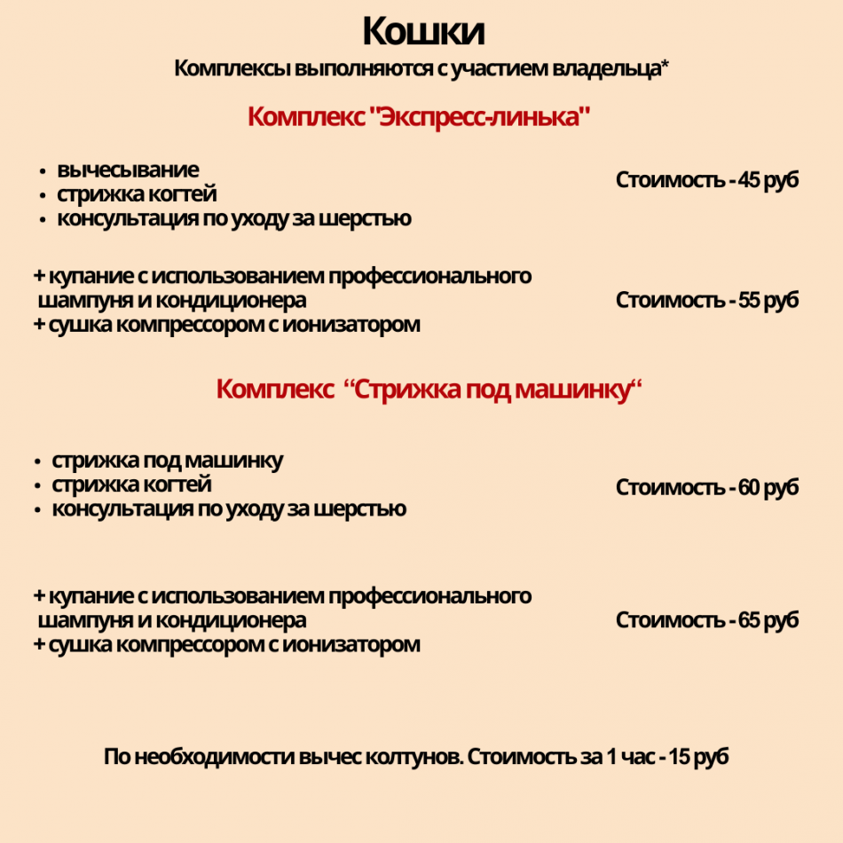 Профессиональный груминг у вас на дому котиков и собак. Стоимость комплексов на фото.